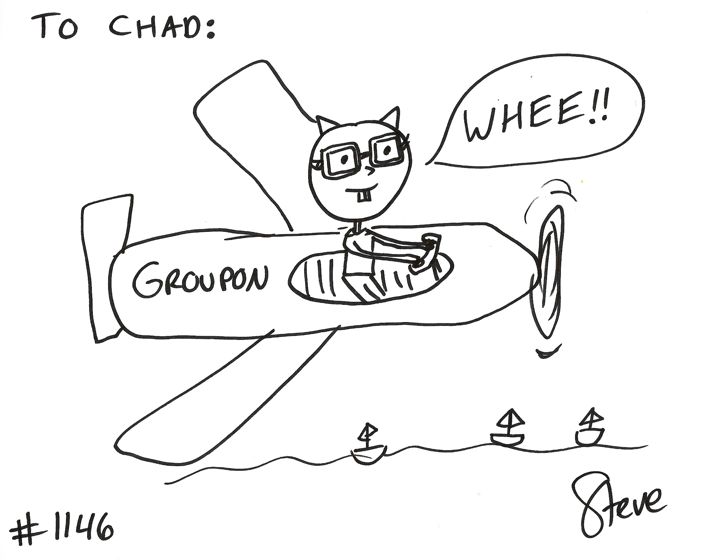 Cat #1146 Posted on August 28, 2011 Chad wanted a cat flying a Groupon airplane over paradise. There are sail boats in the ocean below.