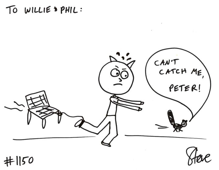 Cat #1150 Posted on August 30, 2011 Kate GIFTED a cat to Willie and Phil. She wanted a cat tied to a lawn chair, chasing a squirrel. His name is Peter!