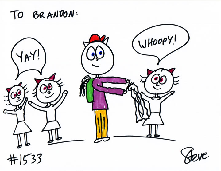 Janel GIFTED a cat to Brandon. She wanted a skinny male cat in a purple and gold track suit with a Bulls cap on. He’s crocheting a long scarf, and has a backpack overflowing with yarn. Three female cats are cheering him on!