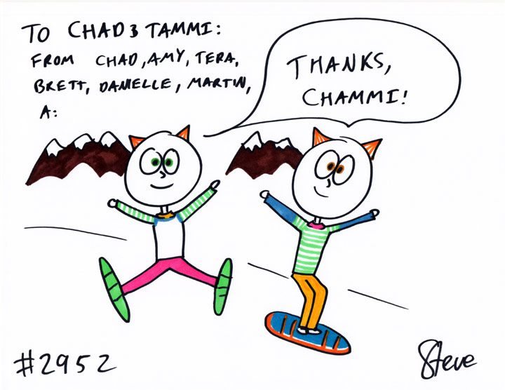 Chad GIFTED a cat to Chad and Tammi. He wanted two cats skiing and snowboarding in Colorado and saying, “Thanks, Chammi!”