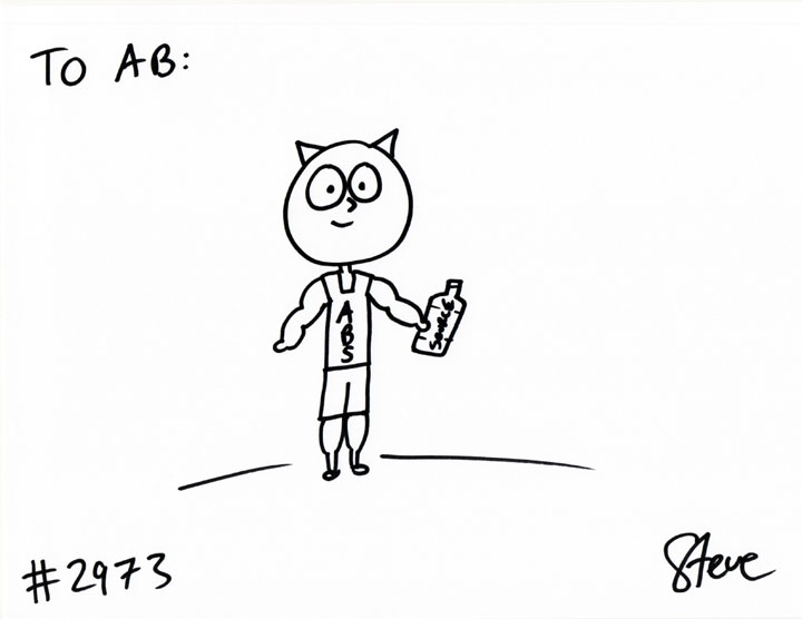 Cat #2973 Posted on February 27, 2012 Carl GIFTED a cat to AB. He wanted a muscular cat with A.B.S. on his shirt, drinking from a water bottle named SOURCE.