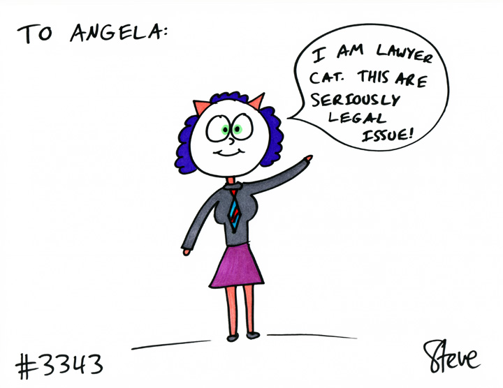 Cat #3343 Posted on March 9, 2012 Matthew GIFTED a cat to Angela. He wanted a Lawyer Cat saying, “I am lawyer cat. This are seriously legal issue.”