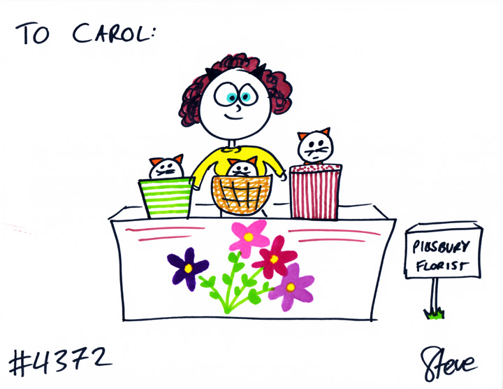 Carol wanted a woman who owns a flower shop named Pilsbury Florist. She has three cats that sit in the counter in plants and baskets!