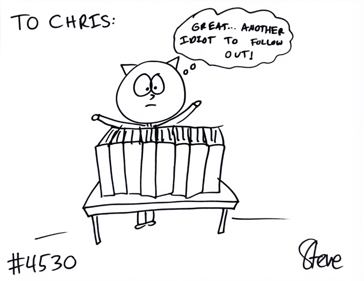 Cat #4530 Posted on April 24, 2012 Chris wanted a cat standing at a chest high table filled with books! He’s thinking, ‘Great… another idiot to follow out!’