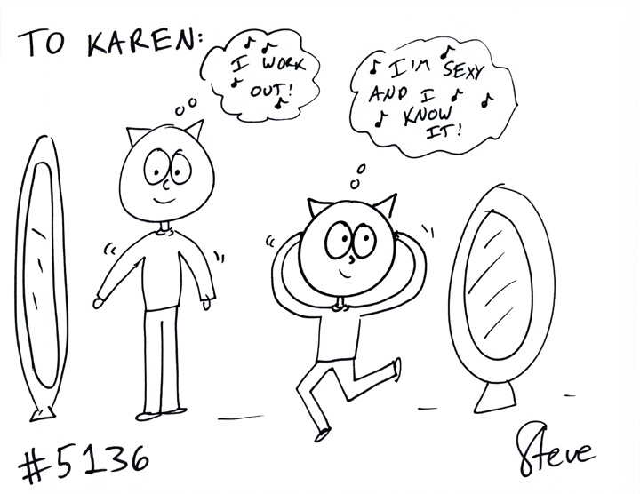 Karen wanted a buff dad cat flexing his muscles in front of the mirror while singing, “I Work Out!” His 4-year old son is in front of another mirror with his hands on his head, dancing to, “I’m Sexy and I Know It!”