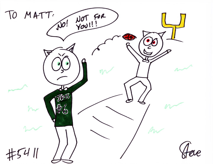 Cat #5411 Posted on May 24, 2012 Jesse GIFTED a cat to Matt! He wanted a NY Jets quarterback in a #6 jersey throwing an interception.