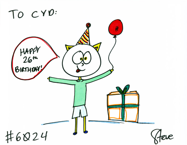Cat #6024 Posted on June 14, 2012 Jessica GIFTED a cat to Cyd. She wanted a Birthday Cat that is celebrating a 26th birthday!