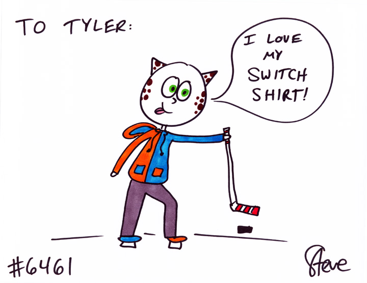 Cat #6461 Posted on June 26, 2012 Nick GIFTED a cat to Tyler! He wanted a cat wearing a two-toned sweatshirt from switchshirts.net!