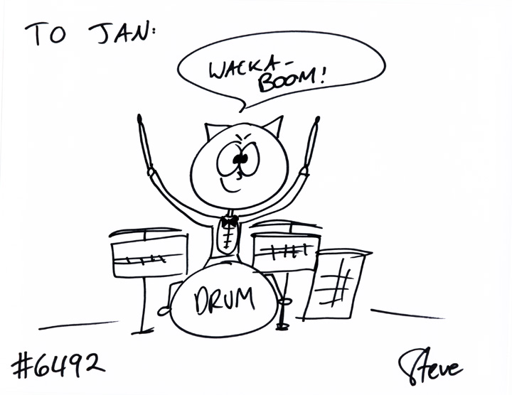 Jan wanted a tuxedo cat playing the drums in a rock band!