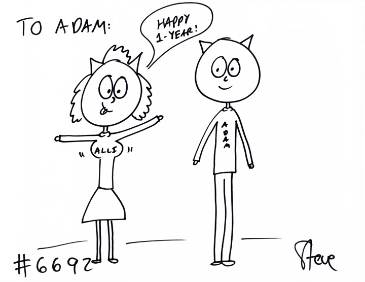 Cat #6692 Posted on July 4, 2012 Allison GIFTED a cat to Adam! She wanted a a girl cat, Alli, wishing a boy cat, Adam, a Happy 1-Year! Whoopy!