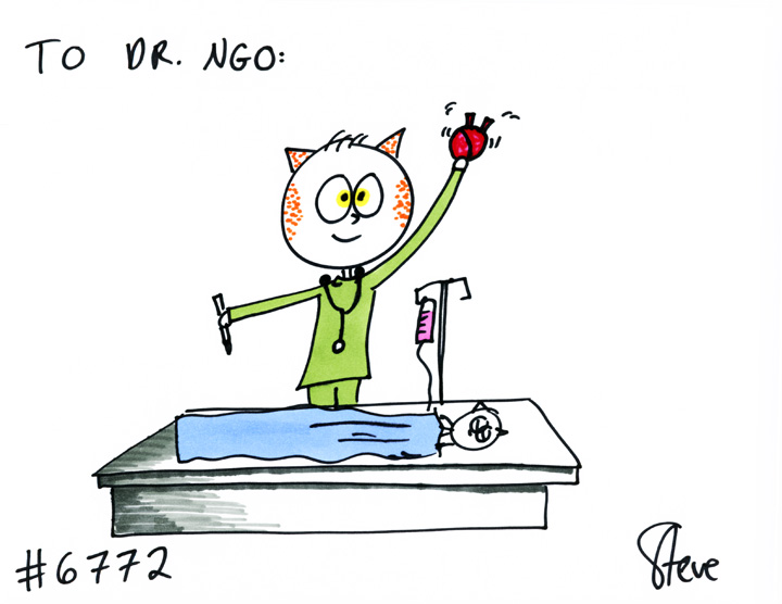 Dr. Ngo wanted a surgeon cat in an operating room, holding a human heart!