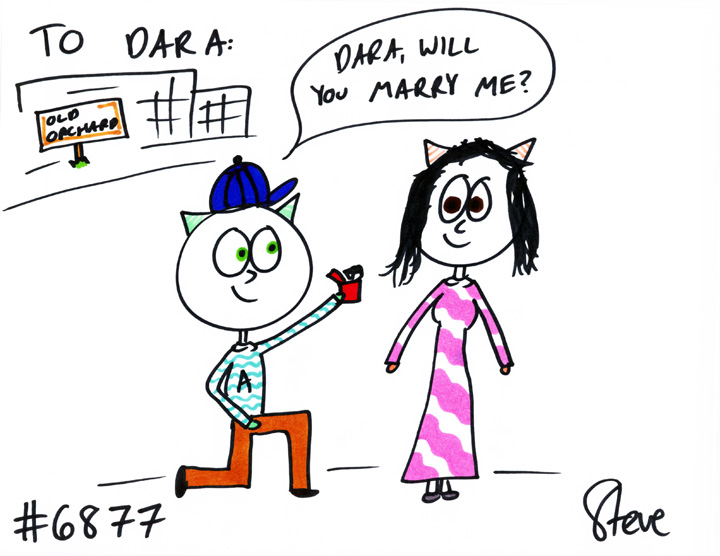 Adam GIFTED a cat to Dara! He wanted a cat proposing to his girlfriend! She has long black hair and he wears a baseball hat. They’re in front of the Old Orchard mall.