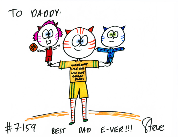 Marlis GIFTED a cat to Daddy! She wanted a muscular dad cat, holding one of his kids on each arm! His little girl loves basketball, and his little boy is in pajamas.