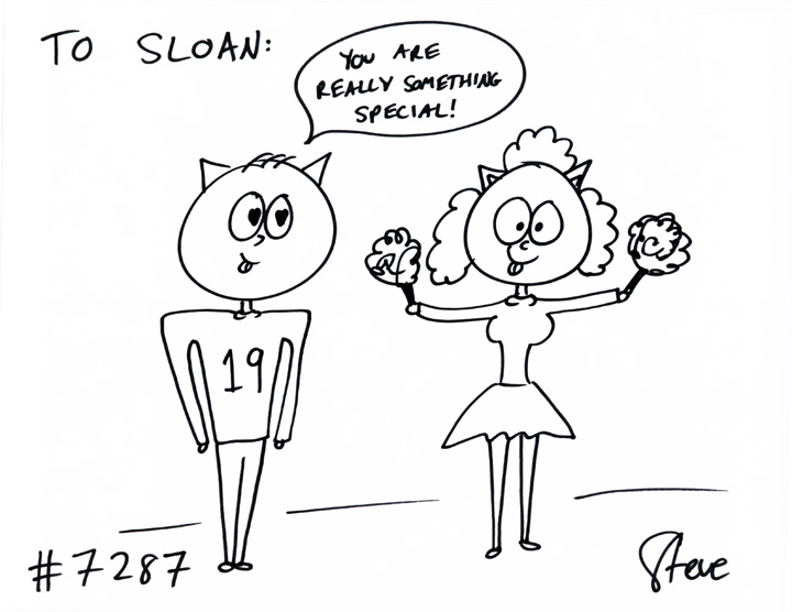 Maxwell GIFTED a cat to Sloan! He wanted a football-player cat, #19, staring at a pretty cheerleader cat! He’s saying, “You are really something special.”