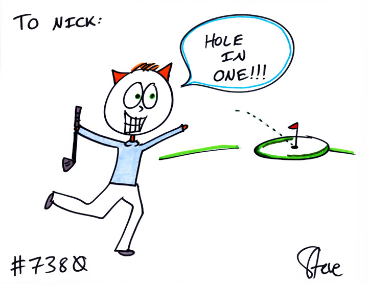 Cat #7380 Posted on July 24, 2012 Lori GIFTED a cat to Nick! SHe wanted a golfing cat, making a hole-in-one! Whoopy!
