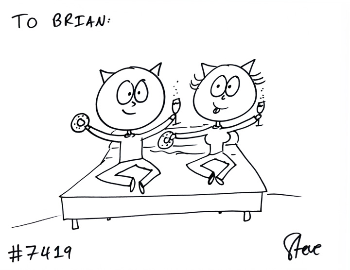 Kim GIFTED a cat to Brian. She wanted boy and girl cats sitting on a bed, eating donuts and drinking champagne!