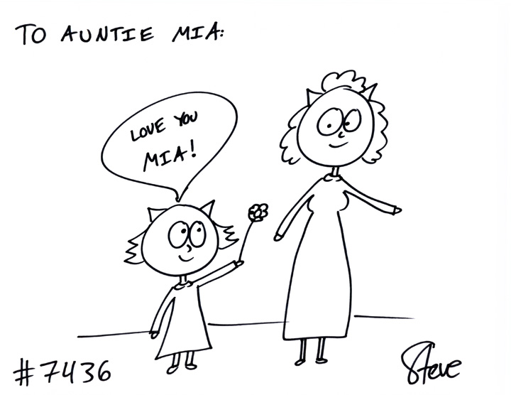Cat #7436 Posted on July 25, 2012 Brandi GIFTED a cat to Auntie Mia. She wanted a little girl cat giving a flower to a lady cat and saying, “Love you, Mia!”