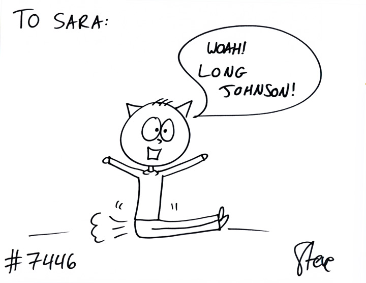 Cat #7446 Posted on July 25, 2012 Jeff GIFTED a cat to Sara! He wanted a cat dragging his butt on the ground saying, “Whoa Long Johnson!”