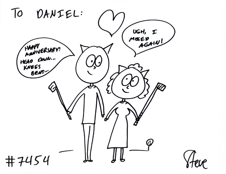 Karen GIFTED a cat to Daniel. She wanted a cat couple on a golf driving range! He’s saying, “Happy anniversary! Head down, knees bent…” while she says, “Ugh, I missed again!”