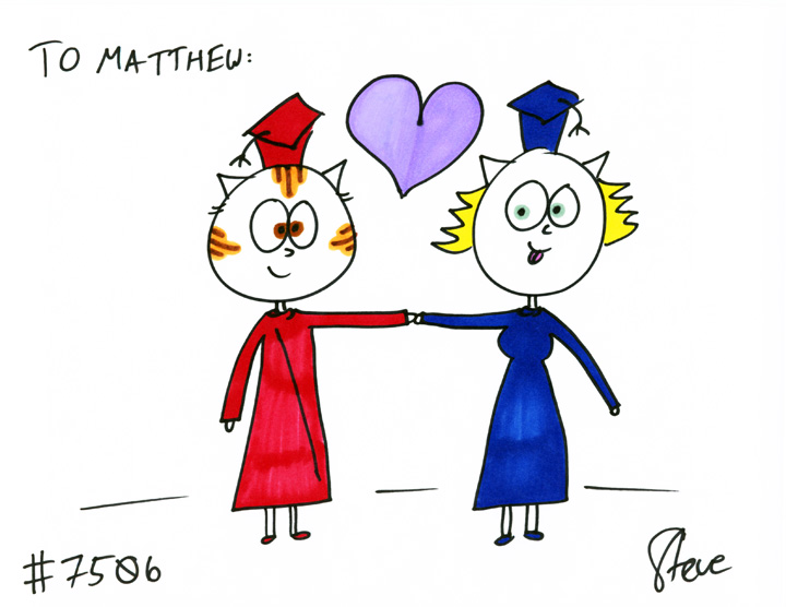 Veronica GIFTED a cat to Matthew. She wanted two cats in graduation caps holding hands. They’re going to miss each other when they go to separate colleges this Fall!