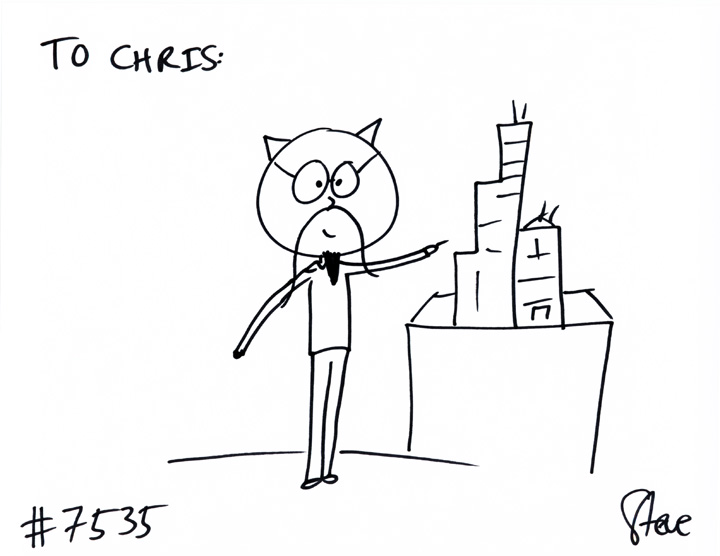 Cat #7535 Posted on July 27, 2012 Heather GIFTED a cat to Chris! She wanted an architect cat with round glasses and a Fu Manchu!