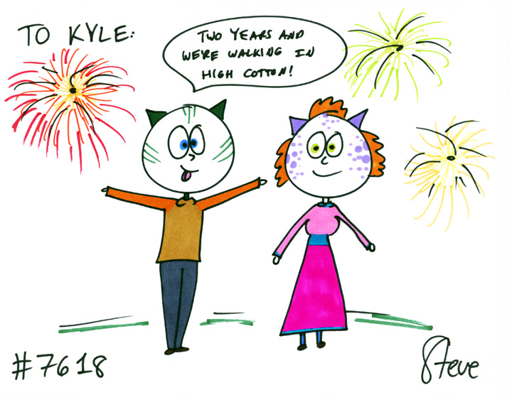 Courtney GIFTED a cat to Kyle. She wanted a boy cat saying to his wife, “Two years and we’re walking in high cotton!” with fireworks in the background.