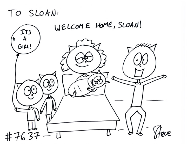 Jake GIFTED a cat to Sloan! He wanted a mommy cat holding a newborn, with a daddy cat and two little boys standing by the bed. Welcome home, Sloan!