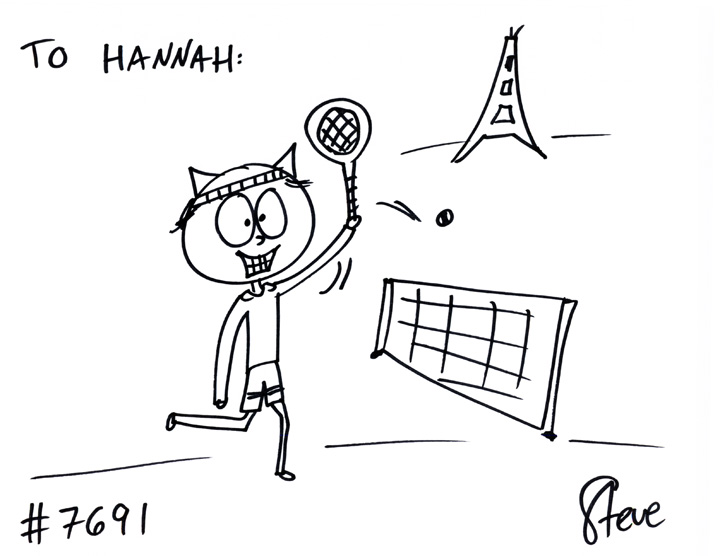 Cat #7691 Posted on August 1, 2012 Sarah GIFTED a cat to Hannah. She wanted a cat playing tennis at the French Open, with the Eiffel Tower in the background!