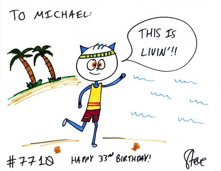 Allison GIFTED a cat to Michael. She wanted a cat running on a tropical island saying, “This is livin’!” Happy 33rd birthday!