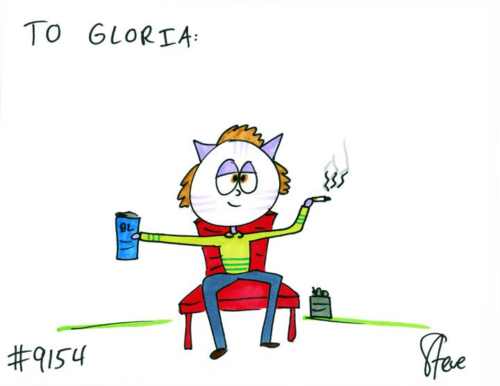 Lisa GIFTED a cat to Gloria. She wanted a cat drinking Bud Light and smoking in a red chair!
