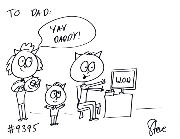 Margaret GIFTED a cat to Dad. She wanted a dad cat on a computer playing World of Warcraft while his son, daughter and mom cat cheer him on!