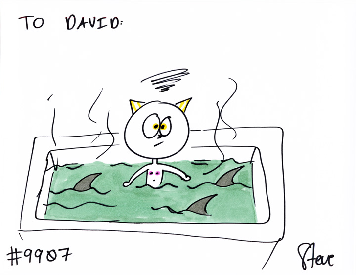 Cat #9907 Posted on December 4, 2012 Beth GIFTED a cat to David! She wanted a cat who looks perplexed, sitting in a hot tub with sharks swimming around.