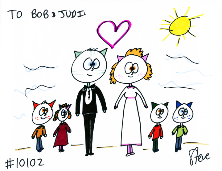 Cat #10102 Posted on December 10, 2012 Robert GIFTED a cat to Bob & Judi. He wanted two cats getting married on the beach, with four little cats with them!