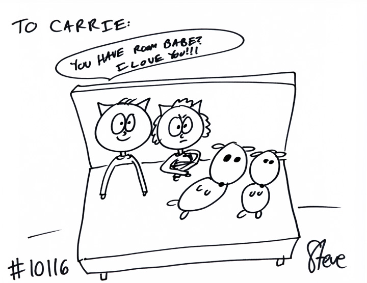 Justin GIFTED a cat to Carrie. He wanted boy and girl cats in bed with their two dogs, Kenzie and Baylee, sprawled out, taking up half of the bed! Hey, you have any room over there?