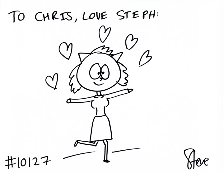 Steph GIFTED a cat drawing to Chris! Whoopy!