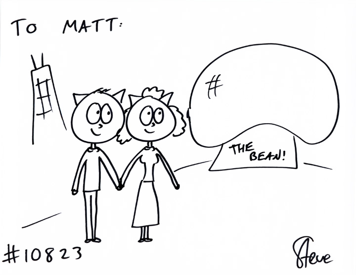 Cat #10823 Posted on January 8, 2013 Megan GIFTED a cat to Matt. She wanted a cat couple looking at The Bean in Chicago!