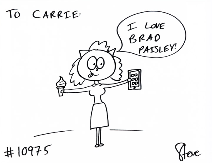 Cat #10975 Posted on January 14, 2013 Preston GIFTED a cat to Carrie! He wanted a cat who loves Dairy Queen, Brad Paisley, and her Samsung Galaxy SIII phone!