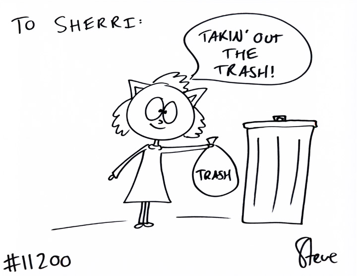 Cat #11200 Posted on January 24, 2013 Thomas GIFTED a cat to Sherri! He wanted a cat doing chores. Takin’ out the trash!