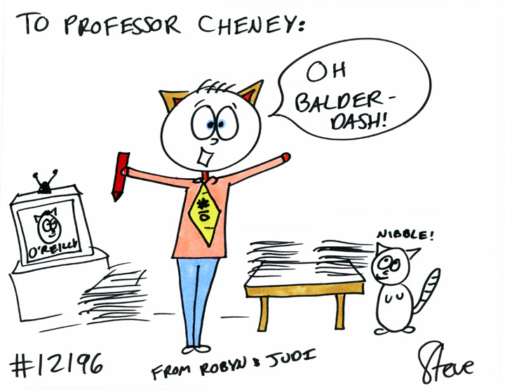 Robyn GIFTED a cat to Professor Cheney! She wanted an English teacher with a $10 bill tie, papers strewn about, and a cat nibbling on his papers! He’s holding a red pen and watching Bill O’Reilly!