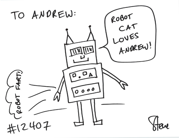 Cat #12407 Posted on May 7, 2013 Jenna GIFTED a cat to Andrew! She wanted a robot cat! Beep boop bop!