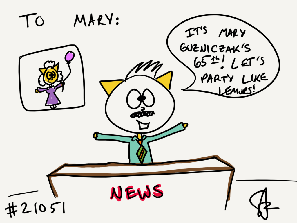 Cat #21051 Posted on July 1, 2021 Susan GIFTED a cat to Mary! She wanted a newscaster cat celebrating Mary’s 65th birthday! Whoopy!