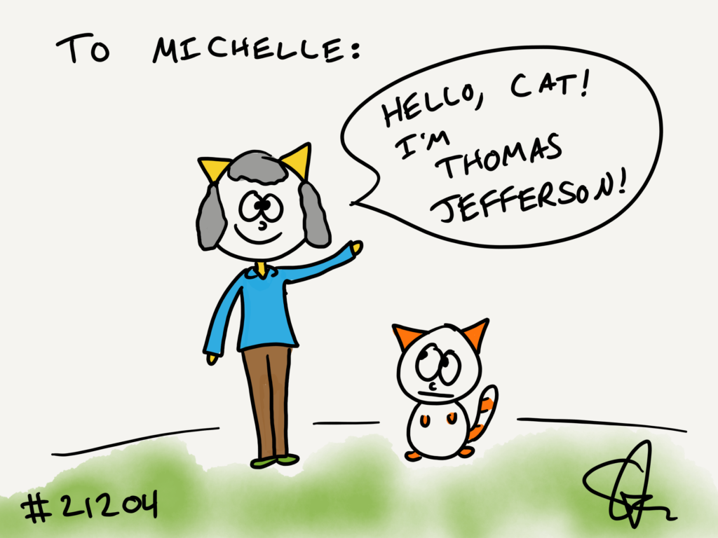 Michelle wanted a Thomas Jefferson cat meeting a cat! Whoopy!