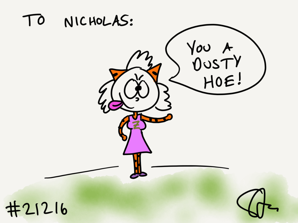 Cat #21216 Posted on September 26, 2021 Blake GIFTED a cat to Nicholas! He wanted a sassy cat saying, “You a dusty hoe!”