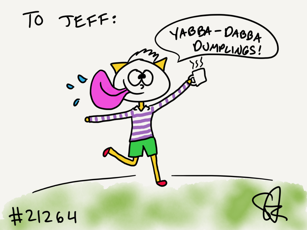 Jeff wanted me to draw whatever I wanted – so I gave him a cat with a big ol’ tongue shouting his super cool catch-phrase: “Yabba Dabba Dumplings!”