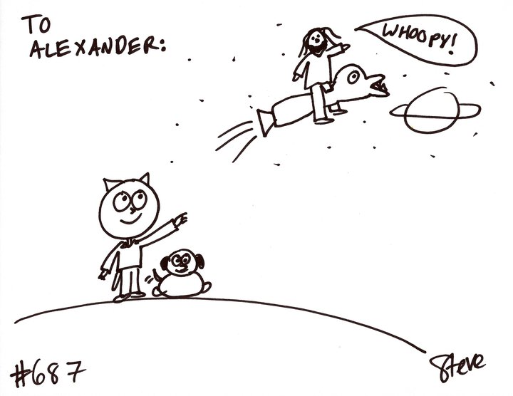 Cat #687 Posted on December 28, 2010 Alexander wanted a black cat named Bowser and his pug friend Trevor watching Jesus ride a rocket T-Rex through space.