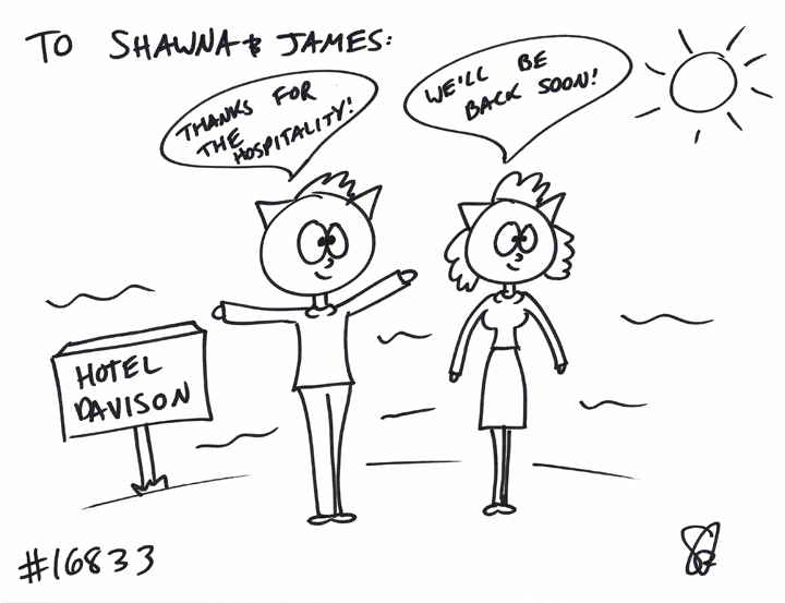 The Sheridans GIFTED a cat to Shawna and James! They wanted two cats leaving Hotel Davison on the beach, happy about all of the hospitality!