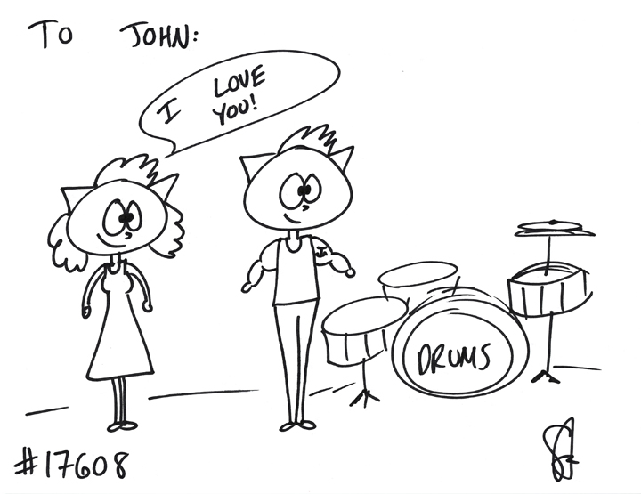 Cat #17608 Posted on October 7, 2014 Ash GIFTED a cat to John! She wanted a guy cat with an anchor tattoo hanging out with a girl and a drum set!