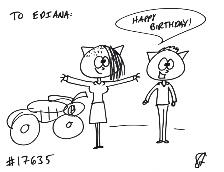 Emily and JD GIFTED a cat to Ediana! They wanted a girl cat with her head shaved on one side. She’s with her motorcycle and a dude! Happy birthday!