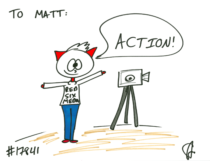 Cat #17841 Posted on November 17, 2014 Kristen GIFTED a cat to Matt! She wanted a video producer cat shooting a film for Red Six Media!