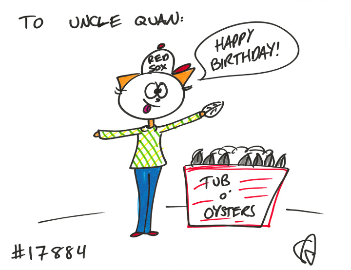 Cat #17884 Posted on November 24, 2014 Samuel Jay GIFTED a cat to Uncle Quan! He wanted a cat wearing a Red Sox cap eating oysters. Happy birthday!